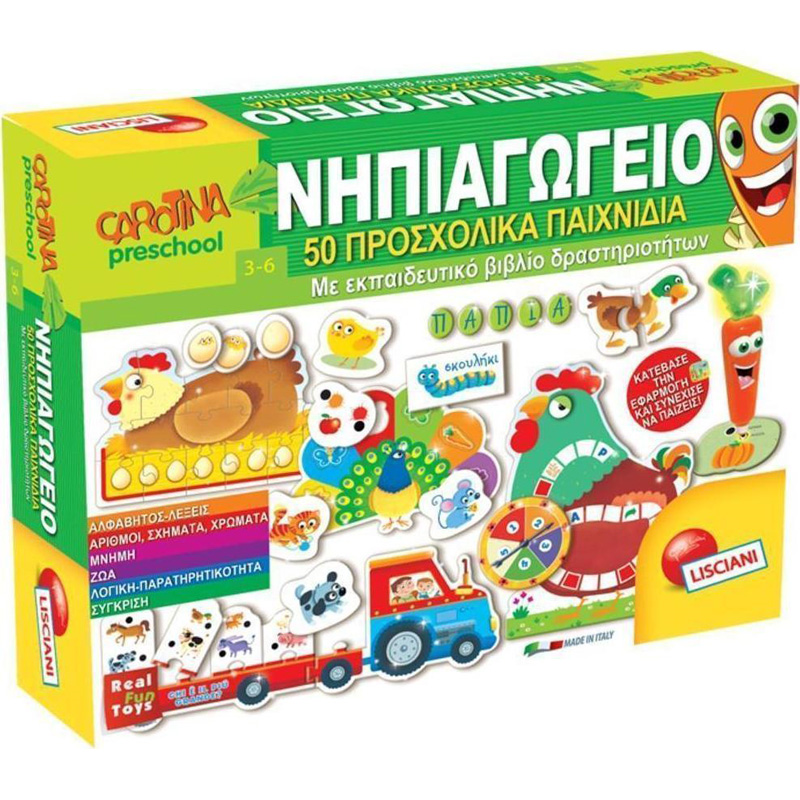 Ένα ολοκληρωμένο σετ με 50 εκπαιδευτικά παιχνίδια με τα ζώα της φάρμας που περιλαμβάνει το ηλεκτρονικό στυλό Καροτίνα που μιλάει και πολλά είδη διαφορετικών δραστηριοτήτων για την εξάσκηση δεξιοτήτων, όπως λογική σκέψη, αξιολόγηση και μνήμη, αλλά και απόκτηση των πρώτων βασικών γνώσεων γλώσσας και μαθηματικών.