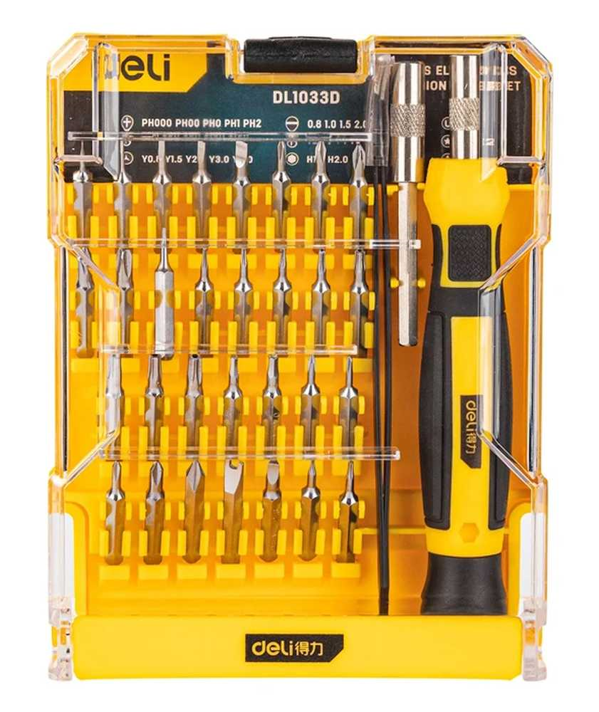 Σετ κατσαβιδιών ακριβείας της Deli το οποίο αποτελείται από 2 κατσαβίδια, 2 επεκτάσεις και 61 διαφορετικές κεφαλές και εξαρτήματα κατσαβιδιού.