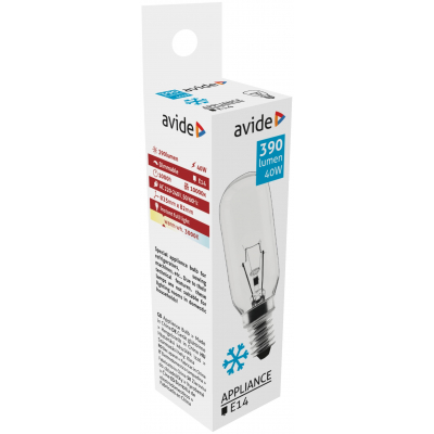 Basic Information Brand Avide EAN 5999097923246 CTN 8539500000 Technology Halogen Bulb shape code T26 Lifespan 1 000 h Brand link avidelighting.com/qr/ARAC14WW-40W Technical Details Socket E14 Power 40 W Voltage range 220-240 V Working temperature -20 - +40 °C IP Class IP20 Diameter 25 mm Height 82 mm Lighting Characteristics Lumen output 390 lm Color temperature WW Color temperature 3 000 K Beam angle 360 ° Functionality Dimmable Yes