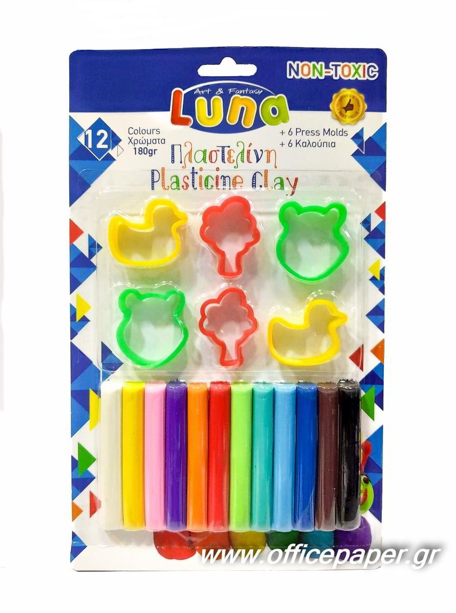 Πλαστελίνη κλασσική Luna 12 χρώματα 180γρ και 6 καλούπια.