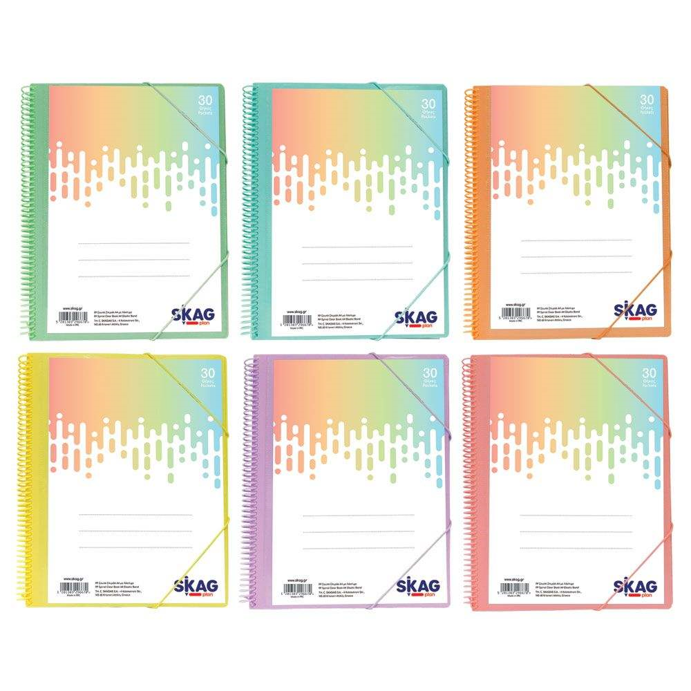 Σουπλ κατασκευασμένα από ανακυκλώσιμο P.P., σε 6 διαφορετικά παστέλ χρώματα (Γαλάζιο, Πράσινο, Κίτρινο, Πορτοκαλί, Φούξια & Μωβ) και διάσταση Α4, από τη SKAG. Διαθέτουν 30 θήκες και 1 εσωτερική, διάφανη θήκη με velcro, σπιράλ και λάστιχο στο ίδιο χρώμα, για την εύκολη και ασφαλή αρχειοθέτηση και οργάνωση των εγγράφων σας. Με εξωτερικό τυπωμένο φύλλο για γρήγορη και εύκολη εύρεση των περιεχομένων. Επιλέξτε τα υψηλής ποιότητας σουπλ της SKAG και αναβαθμίστε την οργάνωση του γραφείου σας σήμερα.