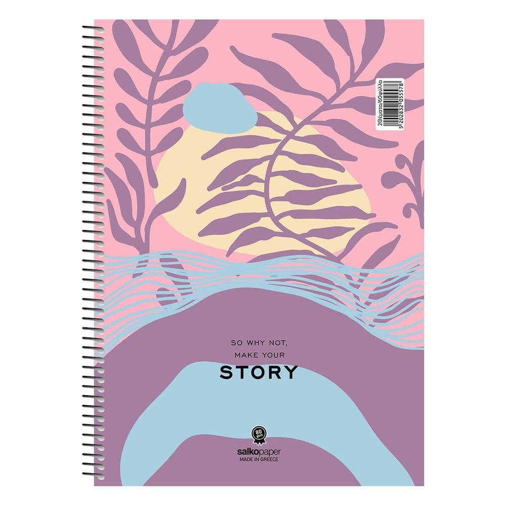 Τετράδιο μονό σπιράλ Story.Glossy πλαστικοποίηση.Πολύ σκληρό οπισθόφυλλο.Χαρτόνι 0,4mm πλαστικοποιημένο.