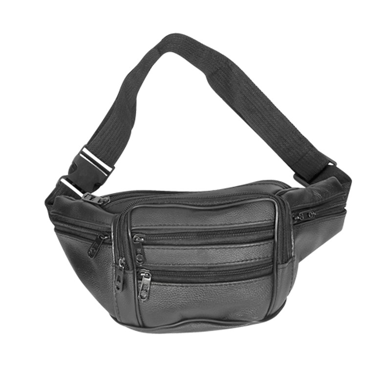 Τσαντάκι μέσης μαύρο από δερμα ,υφασμάτινο ιμάντα και μεταλλικά κλίπ.
